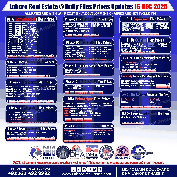 The Pakistan real estate market is undergoing significant changes, presenting a blend of stability, growth potential, and attractive investment opportunities across various cities. As of 15th December 2025, updated file rates from Lahore, Bahawalpur, Gujranwala, Quetta, Karachi, and major housing developments, including LDA City, Lake City, and RUDA projects, offer valuable insights for both investors and end-users. Whether you’re looking for affordable residential options, high-value commercial properties, or emerging projects under the