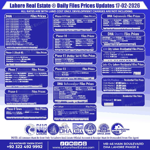 Disclaimer: The file prices listed above are as of 13th February 2026, and may change based on availability, demand, and development progress. Always verify with Lahore Real Estate ® before making any investment decisions.