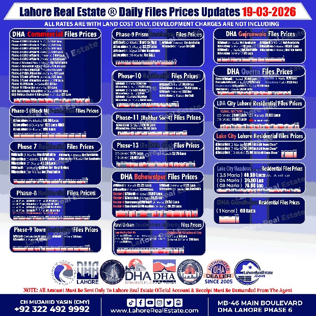 Disclaimer: The file prices listed above are as of 18th March 2026, and may change based on availability, demand, and development progress. Always verify with Lahore Real Estate ® before making any investment decisions.