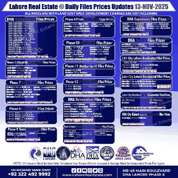 Disclaimer: The file prices listed above are as of 13th November 2025, and may change based on availability, demand, and development progress. Always verify with Lahore Real Estate ® before making any investment decisions.