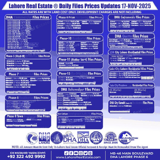 Disclaimer: The file prices listed above are as of 17th November 2025, and may change based on availability, demand, and development progress. Always verify with Lahore Real Estate ® before making any investment decisions.
