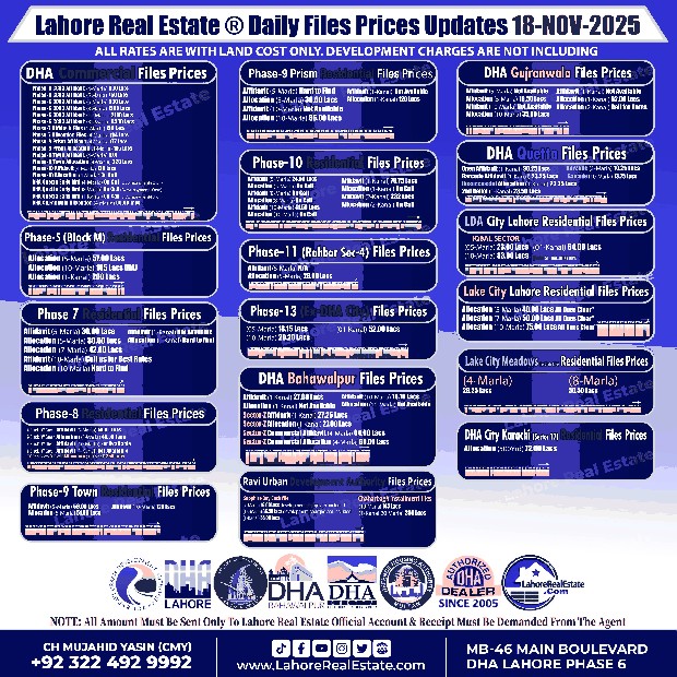 Disclaimer: The file prices listed above are as of 18th November 2025, and may change based on availability, demand, and development progress. Always verify with Lahore Real Estate ® before making any investment decisions.