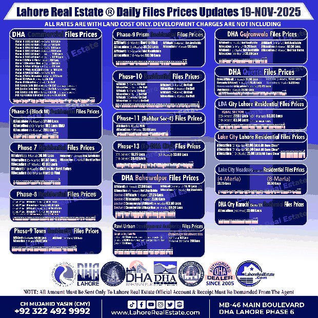Disclaimer: The file prices listed above are as of 19th November 2025, and may change based on availability, demand, and development progress. Always verify with Lahore Real Estate ® before making any investment decisions.