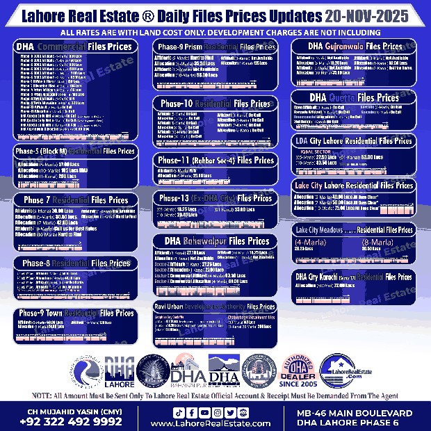 Disclaimer: The file prices listed above are as of 20th November 2025, and may change based on availability, demand, and development progress. Always verify with Lahore Real Estate ® before making any investment decisions.