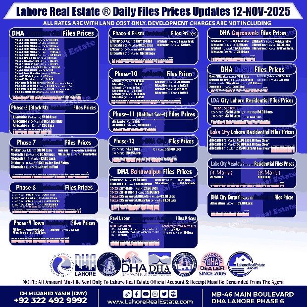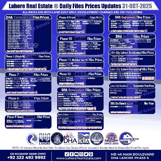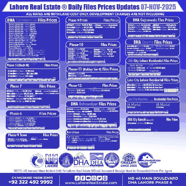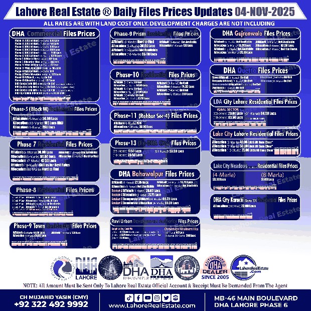 Disclaimer: The file prices listed above are as of 4th November 2025, and may change based on availability, demand, and development progress. Always verify with Lahore Real Estate ® before making any investment decisions.