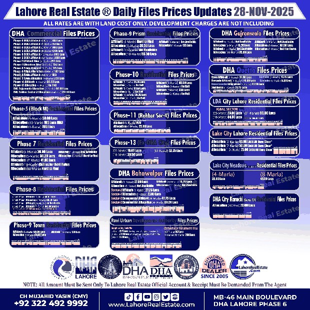 Disclaimer: The file prices listed above are as of 28th November 2825, and may change based on availability, demand, and development progress. Always verify with Lahore Real Estate ® before making any investment decisions.