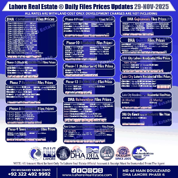 Disclaimer: The file prices listed above are as of 29th November 2925, and may change based on availability, demand, and development progress. Always verify with Lahore Real Estate ® before making any investment decisions.