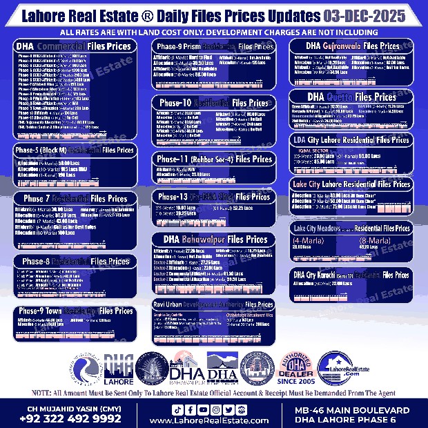 Disclaimer: The file prices listed above are as of 1st December 2925, and may change based on availability, demand, and development progress. Always verify with Lahore Real Estate ® before making any investment decisions.