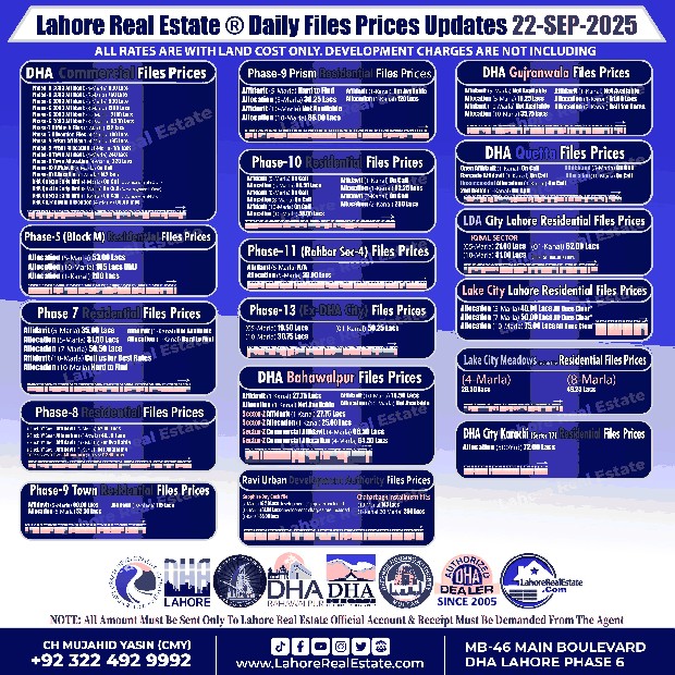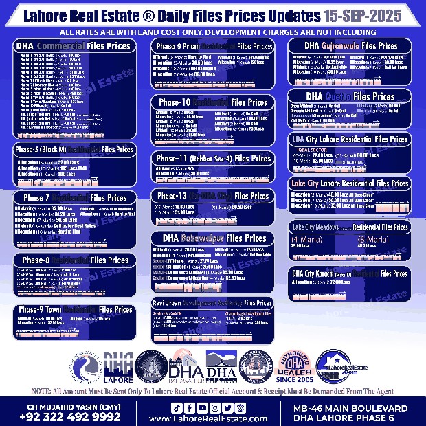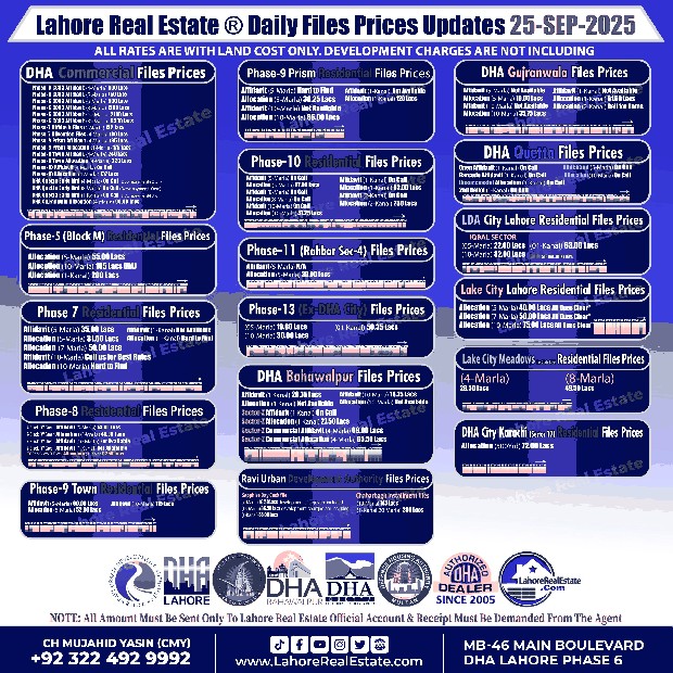 Disclaimer: This update reflects the current market status as of September 15, 2025. File rates can fluctuate. We recommend consulting with Lahore Real Estate ® for the most recent information and expert guidance tailored to your specific investment goals.