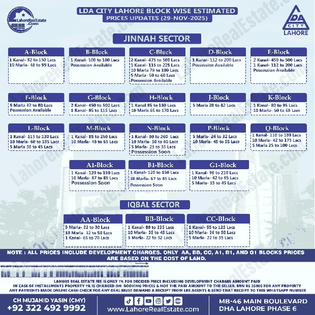 LDA City Lahore Plot Prices Blockwise Rates December 02, 2025