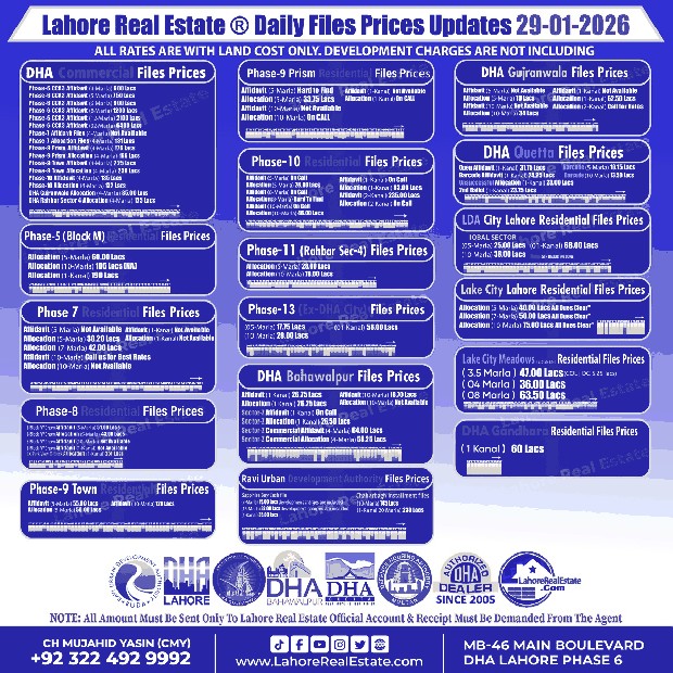 Disclaimer: The file prices listed above are as of 21st January 2026, and may change based on availability, demand, and development progress. Always verify with Lahore Real Estate ® before making any investment decisions.
