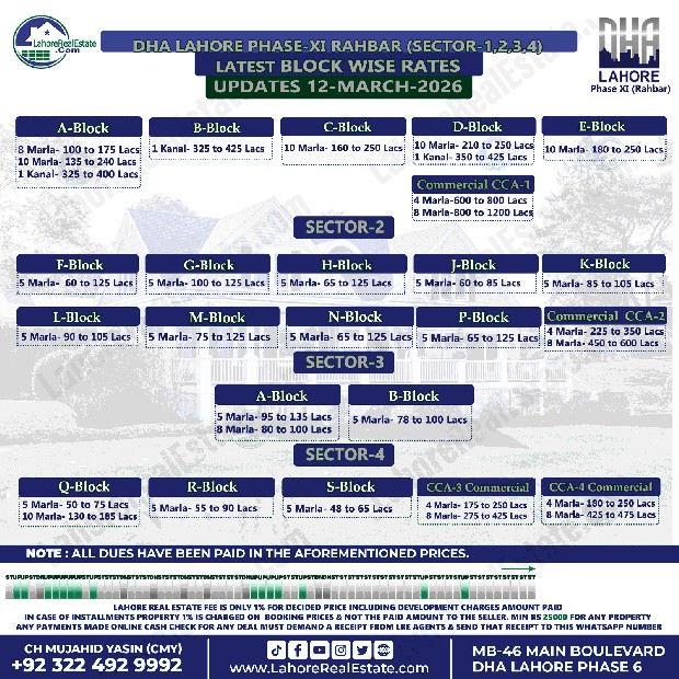 DHA Rahbar Phase 1 2 3 4 Plot Prices Blockwise Rates Update 17-3-2026