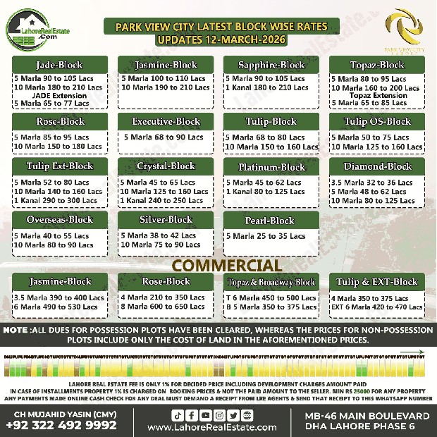 Park View City Lahore Plot Prices Blockwise Rates Update 17-3-2026