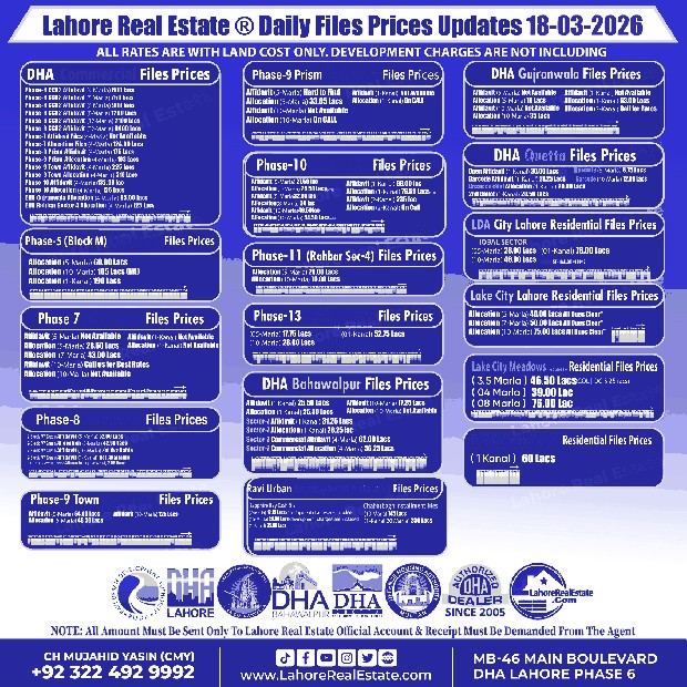 Disclaimer: The file prices listed above are as of 18th March 2026, and may change based on availability, demand, and development progress. Always verify with Lahore Real Estate ® before making any investment decisions.