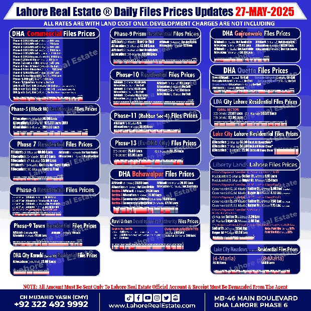 Disclaimer: This update reflects the current market status as of May 26, 2025. File rates can fluctuate. We recommend consulting with Lahore Real Estate ® for the most recent information and expert guidance tailored to your specific investment goals.