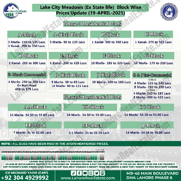 Lake City Meadows Ex State Life Housing Scheme Lahore Plot Prices Blockwise Rates April 21, 2025