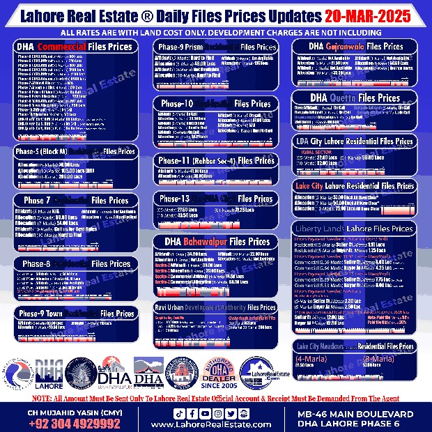 Disclaimer: This update reflects the current market status as of March 20, 2025. File rates can fluctuate. We recommend consulting with Lahore Real Estate ® for the most recent information and expert guidance tailored to your specific investment goals.