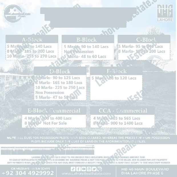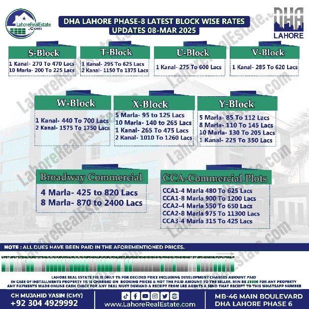 DHA Lahore Phase 8 Plot Prices Blockwise Rates March 11, 2025