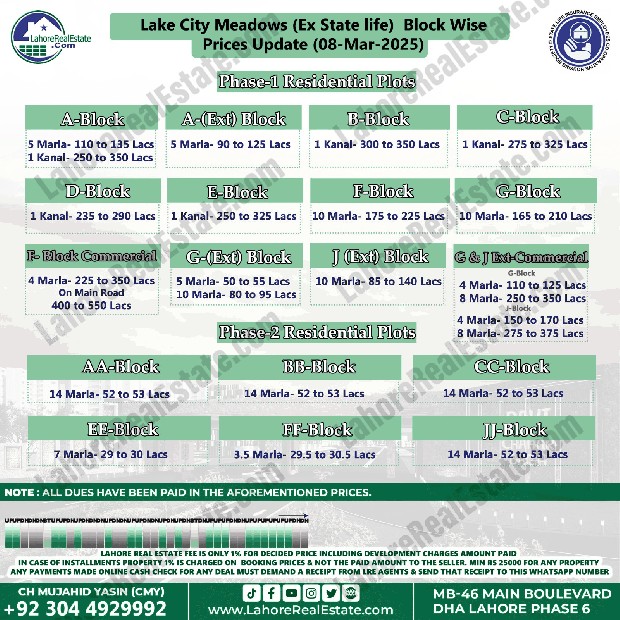Lake City Meadows Ex State Life Housing Scheme Lahore Plot Prices Blockwise Rates March 11, 2025
