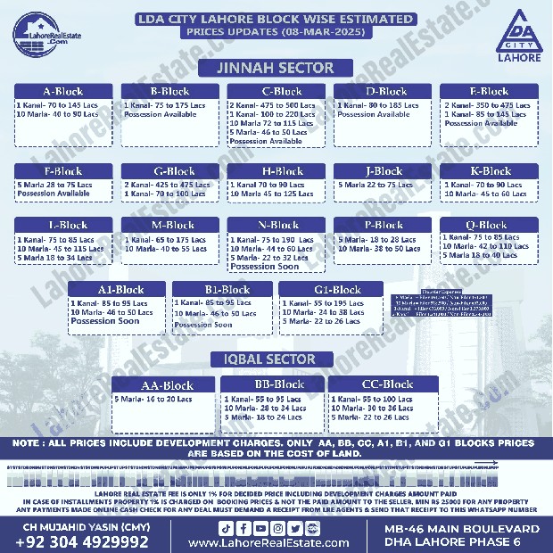 LDA City Lahore Plot Prices Blockwise Rates March 11, 2025