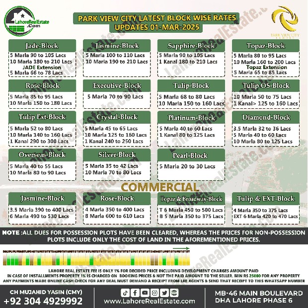 Park View City Lahore Plot Prices Blockwise Rates March 04, 2025