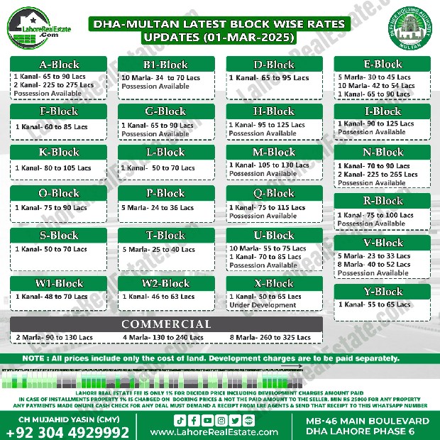 DHA Multan Plot Prices Blockwise Rates March 04, 2025
