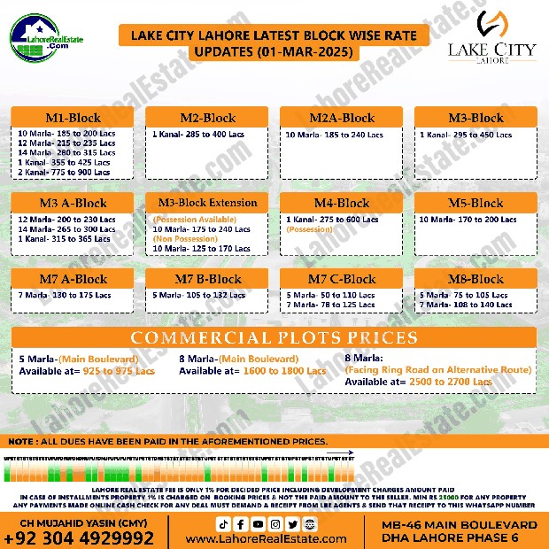 Lake City Lahore Plot Prices Blockwise Rates March 04, 2025