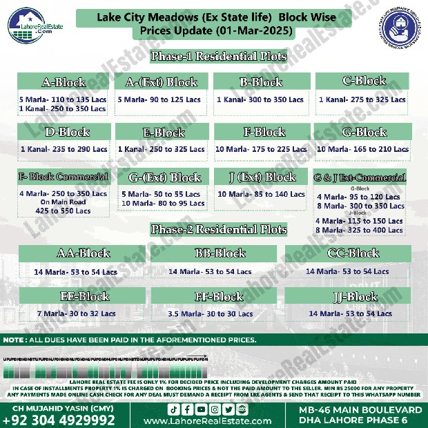 Lake City Meadows Ex State Life Housing Scheme Lahore Plot Prices Blockwise Rates March 04, 2025