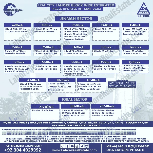 LDA City Lahore Plot Prices Blockwise Rates March 04, 2025