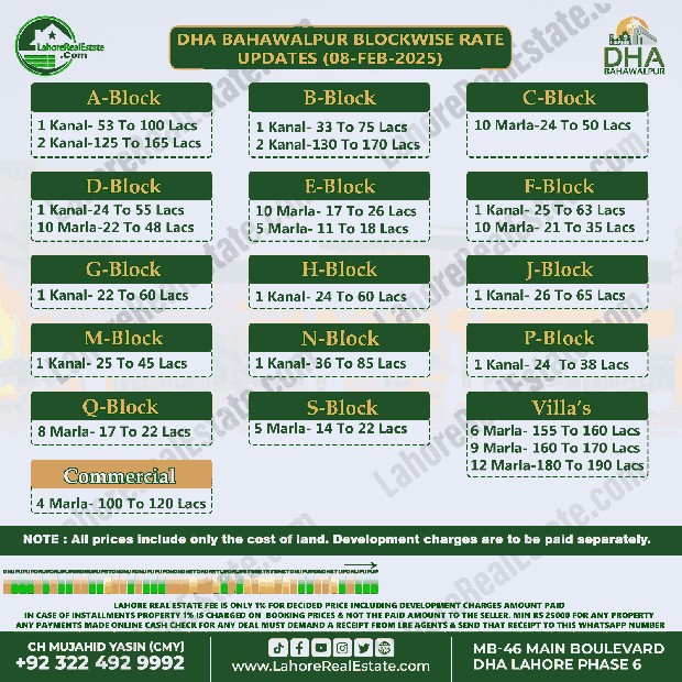 DHA Bahawalpur Plot Prices Blockwise Rates February 10, 2025