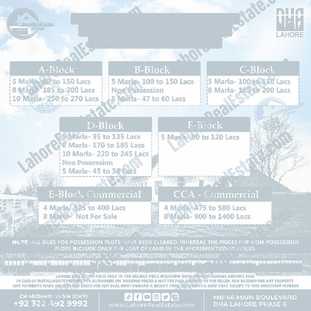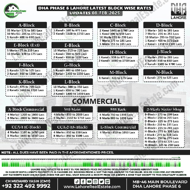 DHA Lahore Phase 6 Plot Prices Blockwise Rates February 10, 2025
