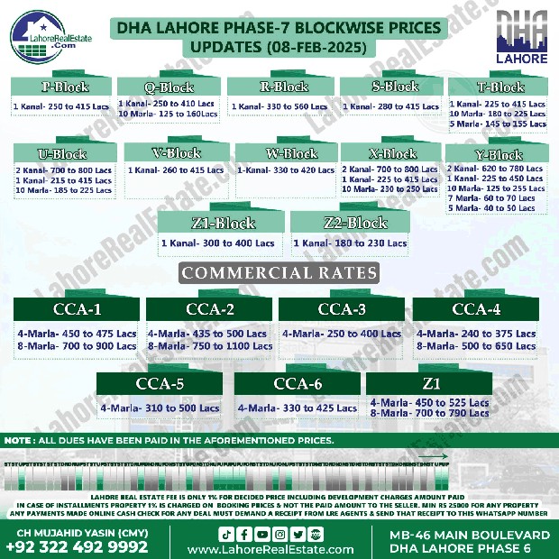 DHA Lahore Phase 7 Plot Prices Blockwise Rates February 10, 2025