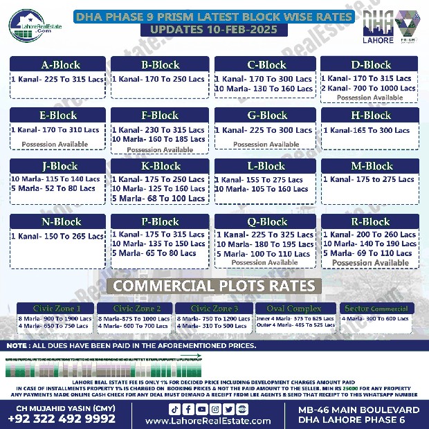 DHA Lahore Phase 9 Prism Plot Prices Blockwise Rates February 10, 2025