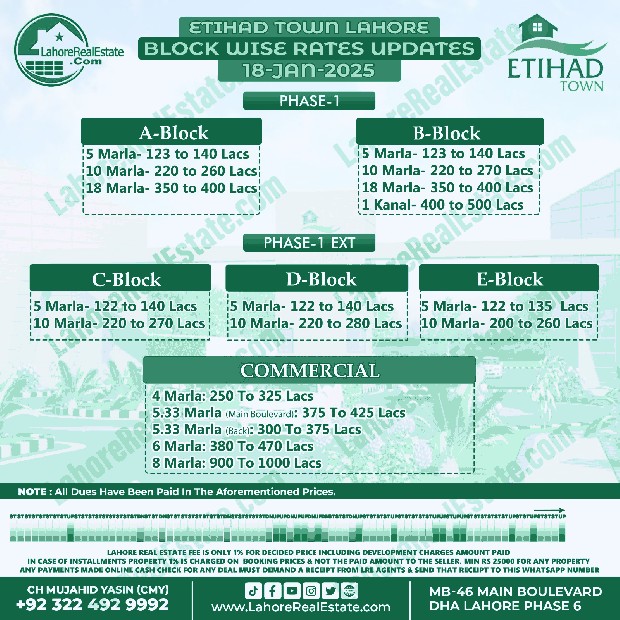 Etihad Town Lahore Plot Prices Blockwise Rates January 20, 2025