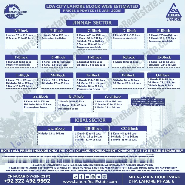 LDA City Lahore Plot Prices Blockwise Rates January 20, 2025