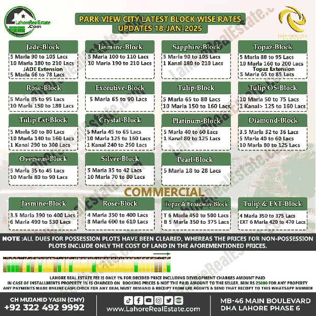 Park VIew City Lahore Plot Prices Blockwise Rates January 20, 2025