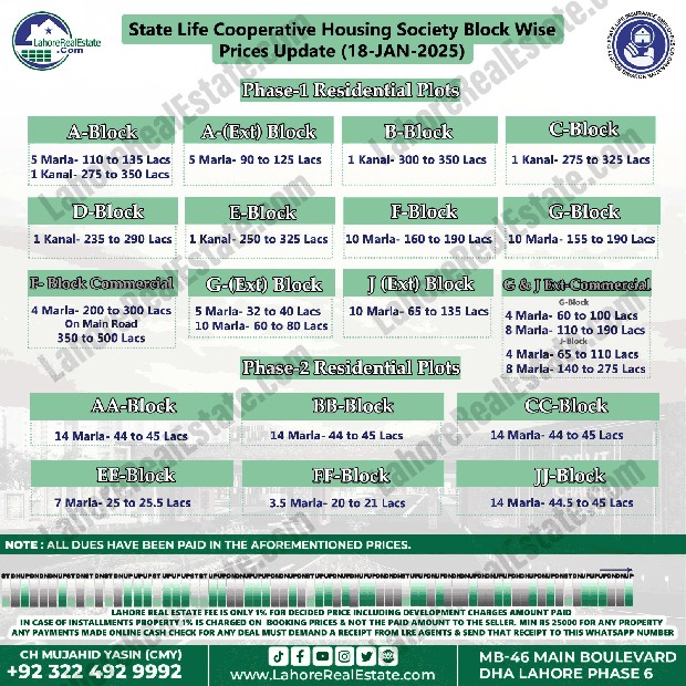 State Life Housing Scheme Lahore Plot Prices Blockwise Rates January 20, 2025
