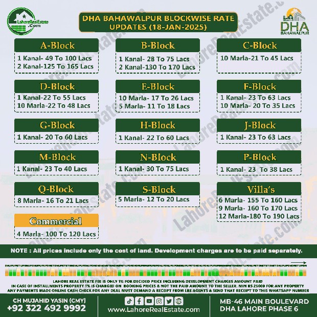 DHA Bahawalpur Plot Prices Blockwise Rates January 20, 2025