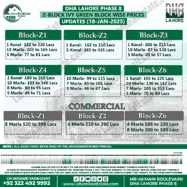 DHA Lahore Phase 8 IVY Green Plot Prices Blockwise Rates January 20, 2025