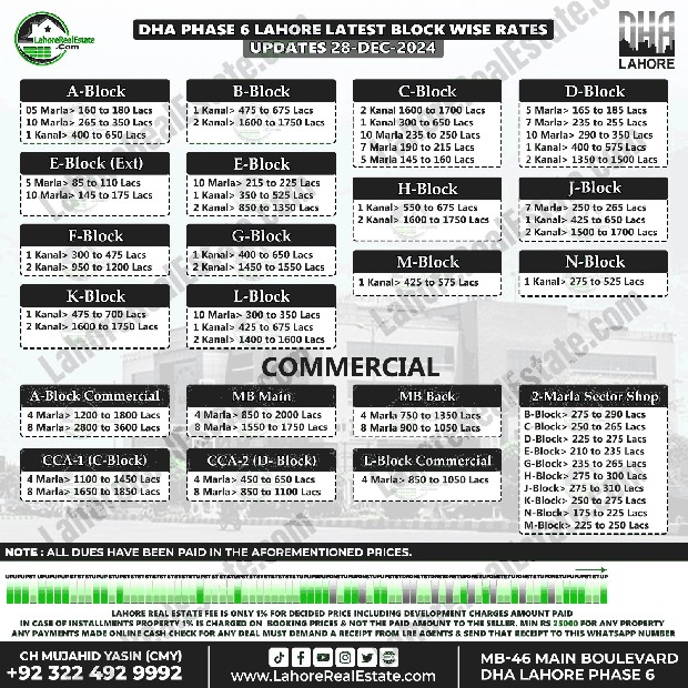 DHA Lahore Phase 6 Plot Prices Blockwise Rates December 30, 2024