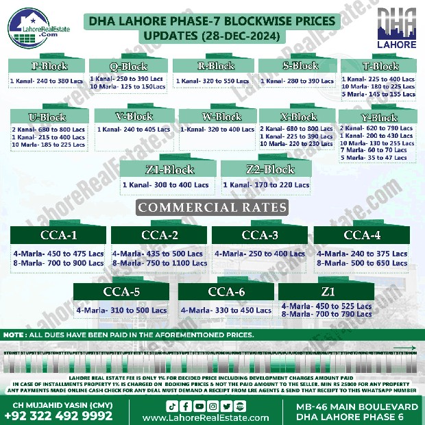 DHA Lahore Phase 7 Plot Prices Blockwise Rates December 30, 2024