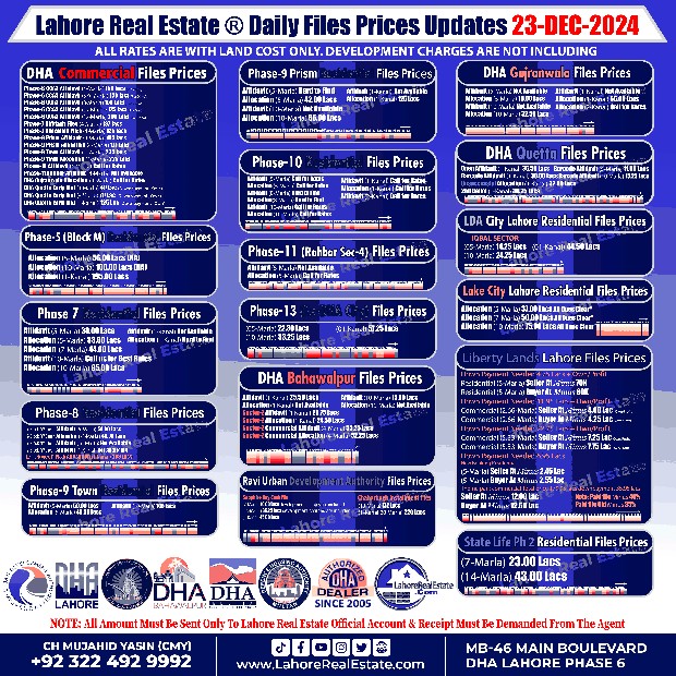 Stay informed of the latest file rates for December 23, 2024. This in-depth guide provides up-to-date pricing information across various phases and sectors, including DHA Phases 5, 6, 7, 8, 9, 10, 11, 13, and more. Discover current market trends, expert insights, and valuable tips for navigating the dynamic real estate market.