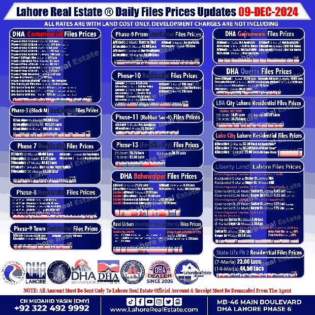 Stay informed about the latest file rates and market trends in top-tier housing societies of Pakistan. This comprehensive overview covers DHA Lahore, DHA Multan, DHA Peshawar, LDA City, Liberty Lands & many more, providing insights into current prices, investment potential, and expert analysis.