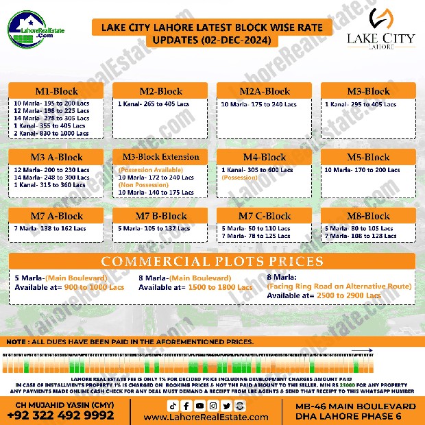 Lake City Lahore Plot Prices Blockwise Rates December 02, 2024