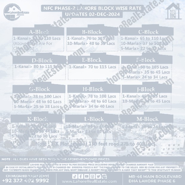 NFC Phase 2 Lahore Plot Prices Blockwise Rates December 02, 2024