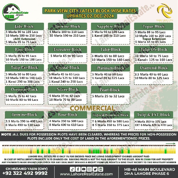 Park View City Lahore Plot Prices Blockwise Rates December 02, 2024