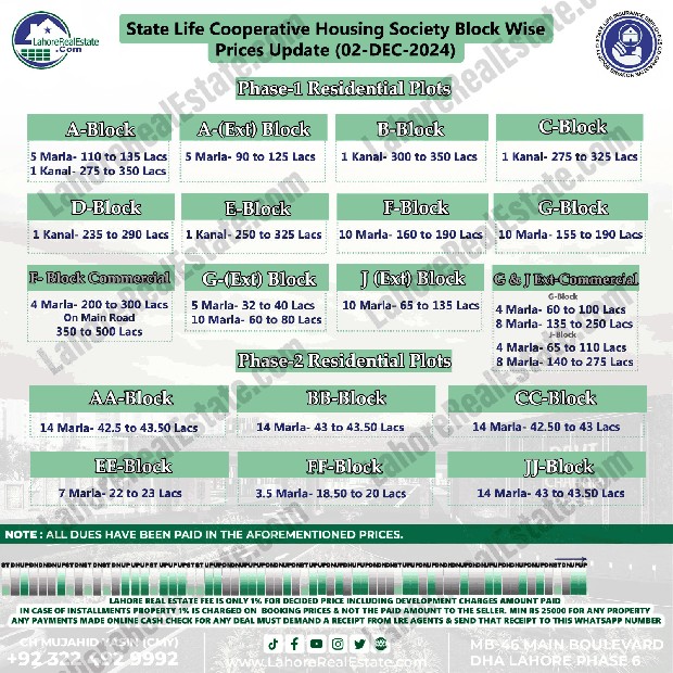 State Life Lahore Plot Prices Blockwise Rates December 02, 2024