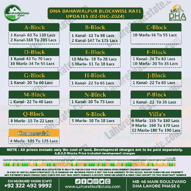 DHA Bahawalpur Plot Prices Blockwise Rates December 02, 2024