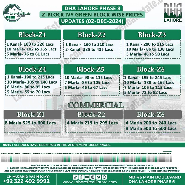 DHA Lahore Phase 8 IVY Green Plot Prices Blockwise Rates December 02, 2024