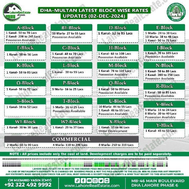 DHA Multan Plot Prices Blockwise Rates December 02, 2024